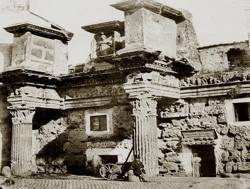La strada passava tra il Tempio (che fu demolito all’inizio del XVII secolo) e l’unico tratto superstite dell’antico muro perimetrale del Foro, costruito in blocchi di tufo. Ad esso si addossano, ancora intatte dopo più di diciannove secoli, due delle oltre cinquanta colonne aggettanti che decoravano i lati lunghi della piazza: le cosiddette “Colonnacce”, così chiamate per il loro stato di rudere. La trabeazione sovrapposta alle Colonnacce reca un fregio scolpito, che in origine si sviluppava per alcune centinaia di metri lungo l’intero perimetro del Foro. Ne restano oggi circa 25 metri, nei quali si distinguono sessantuno figure divise in otto scene, raffiguranti episodi mitologici incentrati sulla dea Minerva.