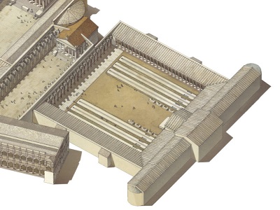 Il nuovo Foro (che in realtà, nelle intenzioni di Vespasiano, era un tempio) era formato da una grande piazza quasi quadrata di 110×105 metri, chiusa con portici colonnati su tre lati. Il quarto lato corrispondeva alla lunga facciata di ingresso lungo l’Argiletum ed era costituita da un semplice muro continuo con un colonnato aggettante all’interno verso la piazza, nel quale si aprivano gli accessi. Sulla parete esterna di questo lato si addossò il muraglione in blocchi di tufo del Foro di Nerva (97 d.C.).