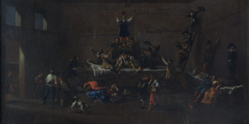 Il Museo di Roma conserva una curiosa opera in cui è rappresentata una goliardica piramide umana all’interno di una taverna, le cui pareti sono gremite di scritte, motti e proverbi. Ma dove siamo e qual è il significato di questa bizzarra pantomima?