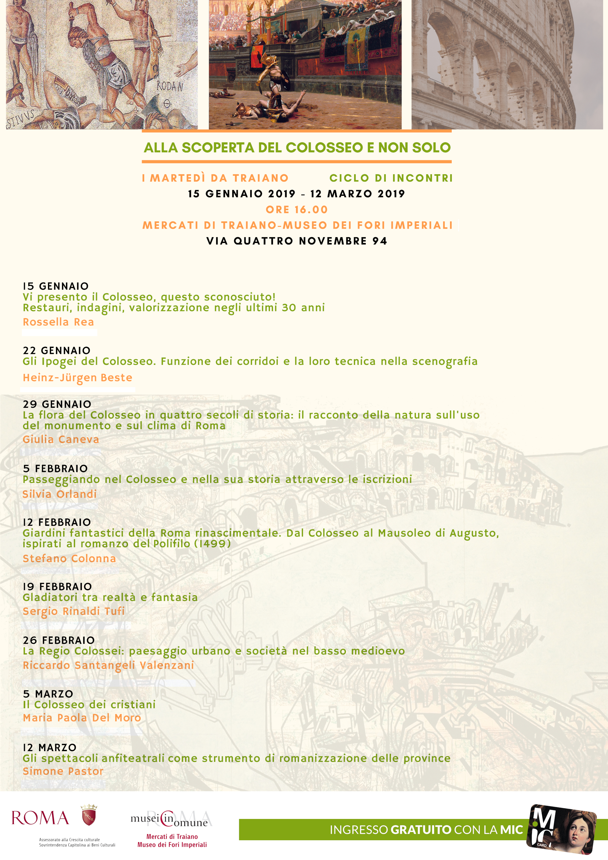 Si comincerà martedì 15 gennaio alle ore 16 con il convegno Vi presento il Colosseo, questo sconosciuto! Restauri, indagini, valorizzazione negli ultimi 30 anni a cura di Rossella Rea, Funzionario archeologo presso la Soprintendenza speciale per il Colosseo. A seguire, nei successivi martedì, sempre alle ore 16 si succederanno: l’incontro con Heinz-Jürgen Beste, dal titolo Gli ipogei del Colosseo: funzione dei corridoi e la loro tecnica della scenografia (22 gennaio); l’incontro con Giulia Caneva intitolato La flora del Colosseo in 4 secoli di storia: il racconto della natura sull’uso del monumento e sul clima di Roma (29 gennaio); Passeggiando nel Colosseo e nella sua storia attraverso le iscrizioni con Silvia Orlandi (5 febbraio); l’incontro con Stefano Colonna in cui si parlerà di Giardini fantastici della Roma rinascimentale. Dal Colosseo al Mausoleo di Augusto, ispirati al romanzo del Polifilo (1499) (12 febbraio); l’incontro Gladiatori tra realtà e fantasia con Sergio Rinaldi Tufi (19 febbraio); La Regio Colossei: paesaggio urbano e società nel basso medioevo con Riccardo Santangeli Valenzani (26 febbraio); Il Colosseo dei cristiani tenuto da Maria Paola Del Moro (5 marzo) e l’incontro con Simon Pastor che parlerà de Gli spettacoli anfiteatrali come strumento di romanizzazione delle province (12 marzo).