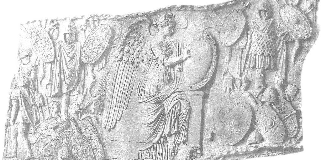 La propaganda traianea motivò la necessità del conflitto contro Decebalo per vendicare Roma dall’oltraggio che il re aveva inferto all’imperatore Domiziano. Il mancato rispetto dei trattati di pace dei Daci gentem numquam fida e soprattutto la necessità di recuperare le insegne delle legioni che vennero sottratte alle truppe sconfitte di Fusco, dodici anni prima, furono la iusta causa della campagna contro i Daci che si esplicita nel peculiare linguaggio iconografico del complesso foro/basilica/colonna connesso con il tema della vittoria e della giustizia trionfanti. Nel  Foro Traiano si mostrava, indelebile, la vittoria: dalle cataste di armi che decoravano il basamento della Colonna Traiana, ai grandi pannelli scolpiti nelle specchiature dell’attico della facciata meridionale della Basilica che servivano a celebrare le legioni che fecero l’impresa, menzionate nelle iscrizioni lungo tutta la facciata; figure di barbari in catene si ergevano dall’Ulpia; antiche allegorie di Vittoria decoravano gli spazi del complesso. Il prodotto di tale esaltazione mitica e guerresca divenne la celebrazione della Pax Traiani, esatto risultato di un’espansione vittoriosa basata su una guerra giusta strumento necessario per integrare nella civiltà e nei costumi romani le popolazioni barbariche.