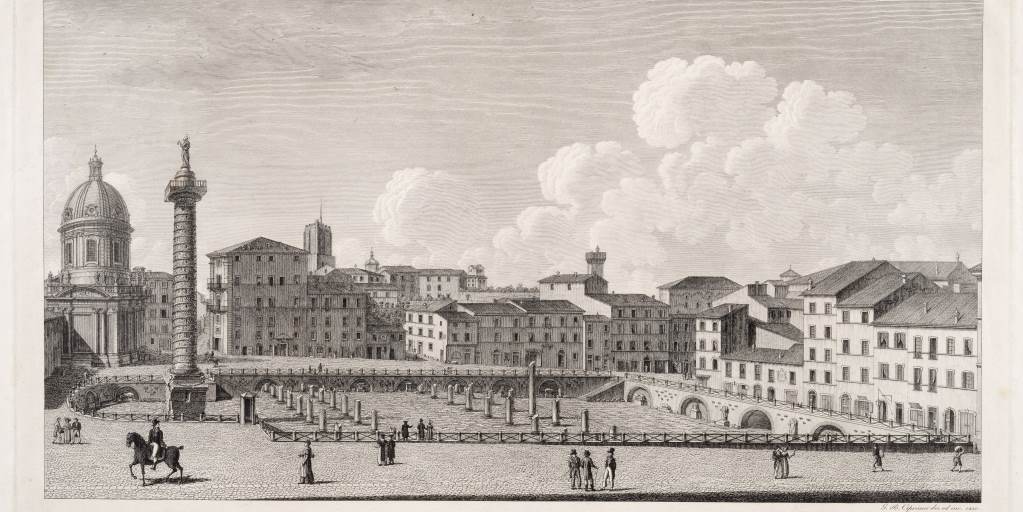 Dopo la fine dell’occupazione e del governo napoleonico di Roma a gennaio 1814, papa Pio VII poté finalmente tornare in città. Egli vi trovò molti cantieri avviati negli anni precedenti ancora non conclusi e decise di portarne a termine alcuni. Tra questi, un posto particolare occupa il cantiere alla Colonna di Traiano, dove i francesi volevano realizzare una grande piazza ellittica ma dove le scoperte archeologiche (e la mancanza di fondi!) portarono a diversi cambiamenti di progetto e alla decisione di mantenere e valorizzare i rinvenimenti.Pio VII chiamò a completare i lavori i due architetti che avevano già progettato la piazza: Giuseppe Valadier e Giuseppe Camporese, che allestirono un’area archeologica all’aperto, musealizzando i frammenti scultorei rinvenuti secondo criteri molto moderni. Ancora oggi dal “Recinto di Pio VII” inizia il percorso di visita nell’area archeologica dei Fori Imperiali.