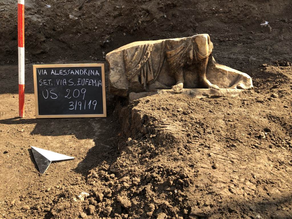 Lo scavo di via Alessandrina, dopo una campagna preliminare nel 2016, si è svolto ininterrottamente da marzo 2018 fino allo scorso novembre sotto la direzione scientifica degli archeologi della Sovrintendenza. L’intervento, di elevato valore scientifico, ha permesso di acquisire molti dati significativi per la ricostruzione della storia del centro monumentale della città di Roma, riportando alla luce una nuova porzione della piazza del Foro di Traiano oltre ai resti delle abitazioni del quartiere medievale, le cui fondazioni poggiavano direttamente sulla piazza del Foro di Traiano, ormai privato della sua pavimentazione originaria a lastre in marmo bianco, di cui restano bene evidenti le impronte sulla malta di preparazione.