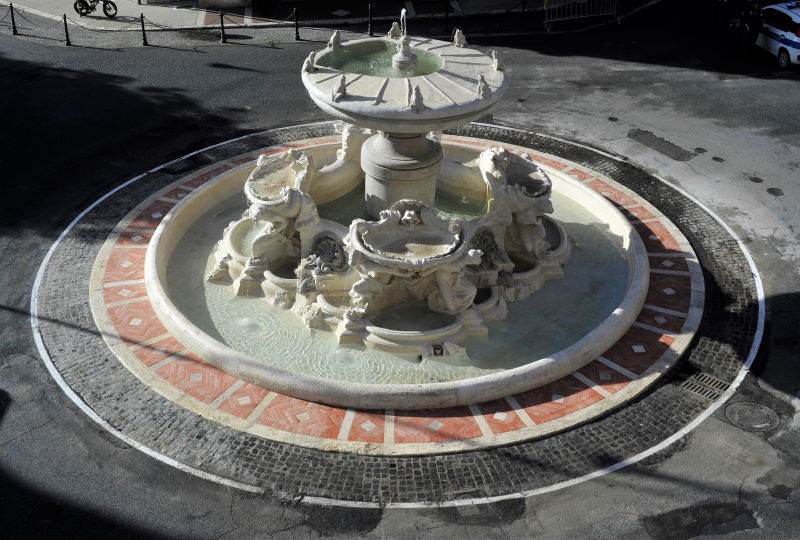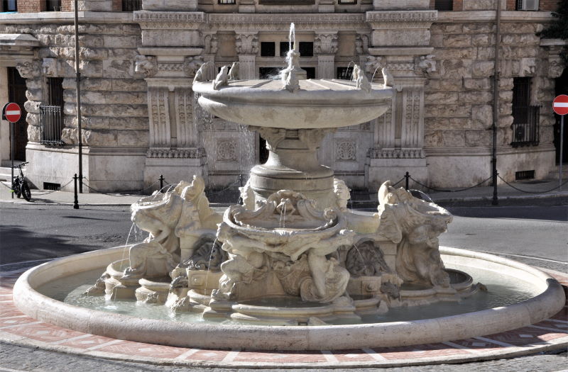 Progettata da Gino Coppedè nel 1920, la fontana fu realizzata nel 1924 con alcune significative varianti: al posto dell’aiuola verde circolare con ciglio lapideo fu posizionata la vasca chiamata comunemente “il laghetto”.