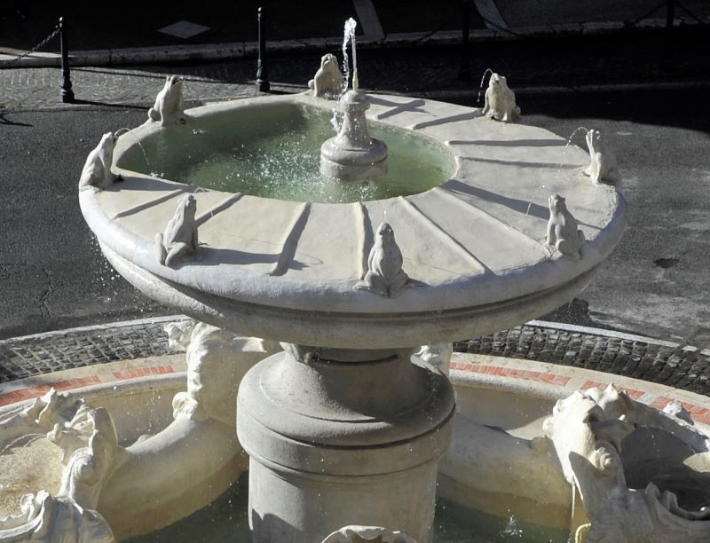 A questa articolata macchina scultorea fa da contrappunto il gioco delle acque: quelle stagnanti del laghetto, gli spruzzi e i getti incrociati delle figure maschili e delle rane, le cascatelle delle valve di conchiglia, il velo del catino, l’esuberante getto superiore.
