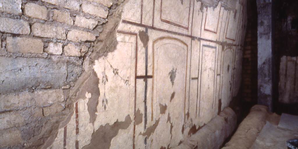 La decorazione ad affresco è articolata in riquadri rettangolari all'interno dei quali si trovano diversi elementi decorativi e sembra databile agli inizi del III secolo d.C. Di particolare interesse è la presenza di incisioni di natura spontanea, tracciate con le dita sull'intonaco ancora fresco e raffiguranti animali, figure umane stilizzate, simboli osceni, barche, oltreché inscrizioni in latino e greco, anch'esse di contenuto licenzioso.