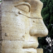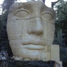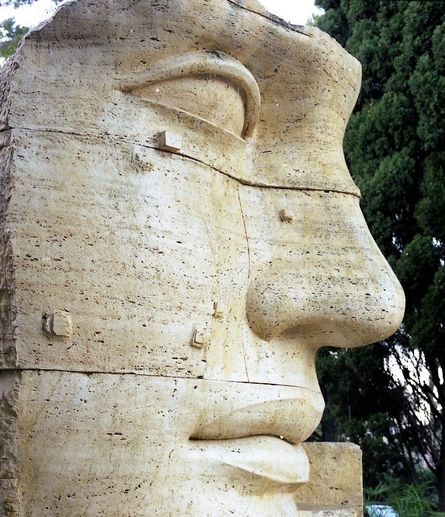 L’opera, costituita da più blocchi di travertino con i giunti ben visibili, raffigura un frammento di volto femminile dai lineamenti fortemente idealizzati, segnato da piccole bugne.
