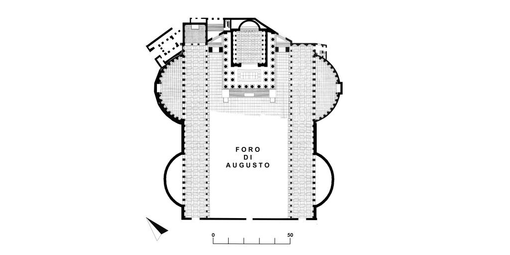 In realtà, il nuovo complesso aveva dimensioni imponenti, con un perimetro complessivo di circa 120 x 120 metri e si articolava intorno a una piazza rettangolare di circa 70 x 50 metri. Nel centro del lato corto orientale era inserito il Tempio di Marte Ultore mentre i lati lunghi erano occupati da portici colonnati. I portici si aprivano, a loro volta, ciascuno su due emicicli del diametro di 40 metri destinati ad accogliere tribunali i due a est (i cui resti sono ancora visibili) e, forse, archivi i due a ovest (non più esistenti).