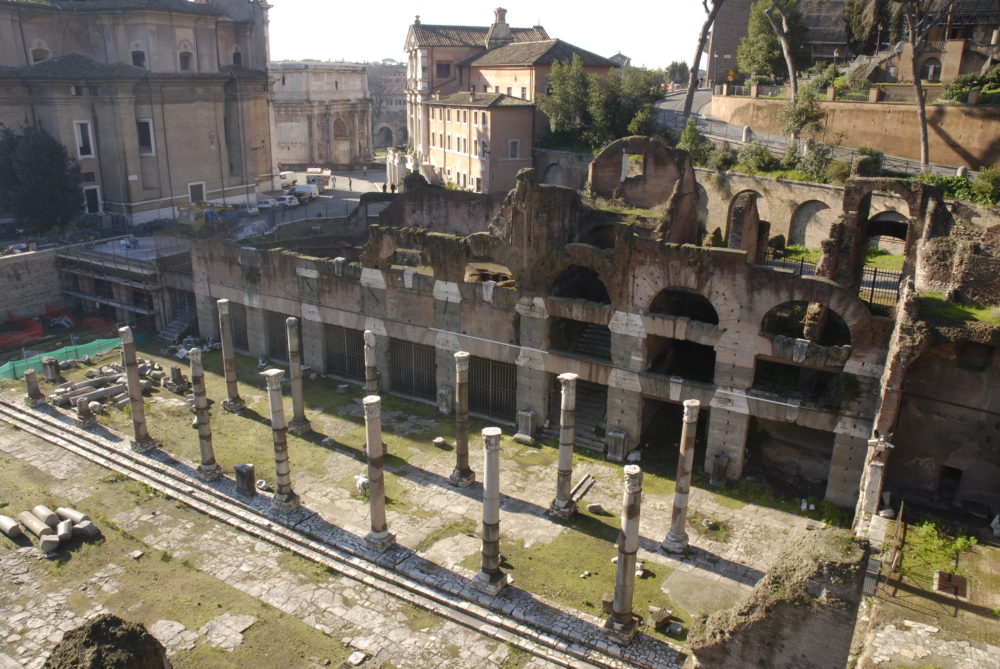 Poco dopo l’inaugurazione del 46 a.C., se non più tardi, fu costruita a ridosso del portico occidentale una fila di ambienti inseriti tra il retro del portico stesso da una parte e le pendici del Campidoglio dall’altra. Identificati tradizionalmente con delle tabernae, ossia botteghe, secondo gli studi più recenti questi ambienti sarebbero in realtà uffici pubblici legati al buon funzionamento del Foro.