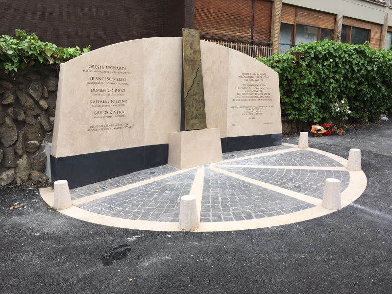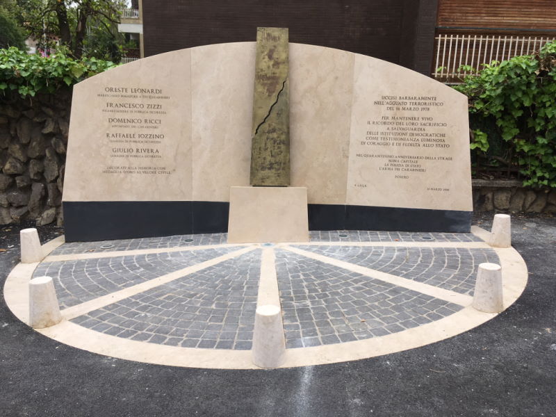 Successivamente, il corpo di Aldo Moro fu rinvenuto in via Michelangelo Caetani e ivi fu posta una lapide commemorativa. Contemporaneamente fu realizzata una targa commemorativa in via Mario Fani, che risultava però nel tempo esposta a degrado ambientale. Inoltre la ridotta ampiezza del marciapiede in corrispondenza della targa stessa e la presenza dell’attraversamento pedonale e di un palo dell’illuminazione pubblica comportavano la necessità di ridefinire totalmente l’area, al fine di conferire decoro e solennità al luogo della strage. Nella ricorrenza del 40° anniversario dell’attacco terrorista, la Sovrintendenza ai Beni Culturali di Roma Capitale in accordo con la Direzione Affari Generali della Polizia di Stato e il Comando Generale dell’Arma dei Carabinieri dedicò ai Caduti di via Fani un monumento con un profondo valore simbolico e con caratteristiche formali di sobrietà e linearità espresse anche attraverso l'uso di materiali di pregio. La Commissione Storia e Arte espresse parere favorevole alla realizzazione della nuova memoria nel corso della riunione del 6 novembre 2017.