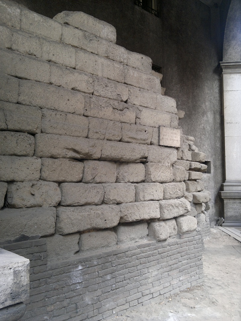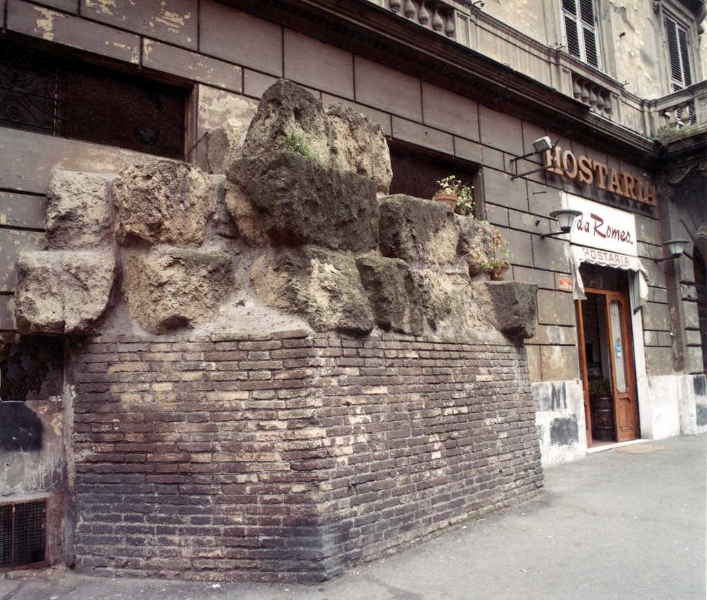 Resti di murature in grandi blocchi di tufo giallo, in alcuni casi poco visibili, in altri imponenti, costituiscono oggi la sola testimonianza della cinta muraria nota come Mura Serviane. Del più antico recinto, databile effettivamente al VI secolo a. C. e attribuito all’iniziativa del re Servio Tullio, si conservano alcuni avanzi in blocchi più piccoli di tufo granulare grigio. La gran parte di quanto si conserva delle mura va in realtà assegnata alla ricostruzione effettuata agli inizi del IV secolo a.C., poco dopo il grande saccheggio di Roma ad opera dei Galli nel 390 a.C. Questa datazione, oltre che dalle fonti letterarie, è confermata proprio dall’utilizzo di un particolare tipo di tufo, detto “tufo giallo di Grotta Oscura”, le cui cave si trovavano nel territorio di influenza della città etrusca di Veio; l’impiego massiccio a Roma di questo tipo di tufo si deve quindi datare successivamente alla conquista della città avvenuta nel 396 a.C.