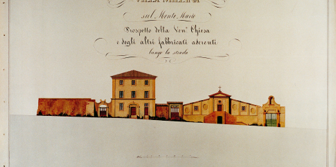 Villa Millina sul Monte Mario - Prospetto della chiesa e degli altri fabbricati aderenti lungo la via Trionfale alla metà dell’Ottocento - disegno acquarellato degli architetti Gaspare Servi e Salvatore Parisi, Archivio Storico Capitolino (Archivio Cardelli)