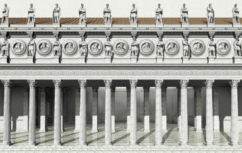 Una seconda fila di statue simili era forse collocata anche lungo la cima dei portici con funzione di acroteri. Le statue dei Daci erano un chiaro riferimento alle due guerre combattute da Traiano contro questo popolo (nel 101-102 e nel 105-106 d.C.) oltre che al ricchissimo bottino che si ricavò dalla conquista della Dacia (corrispondente in gran parte all’attuale Romania) e che servì a finanziare la costruzione del Foro di Traiano stesso. I grandi busti neiclipei ritraevano membri della famiglia imperiale e personaggi famosi, a ideale proseguimento dell’analoga galleria esistente nel vicino Foro di Augusto.