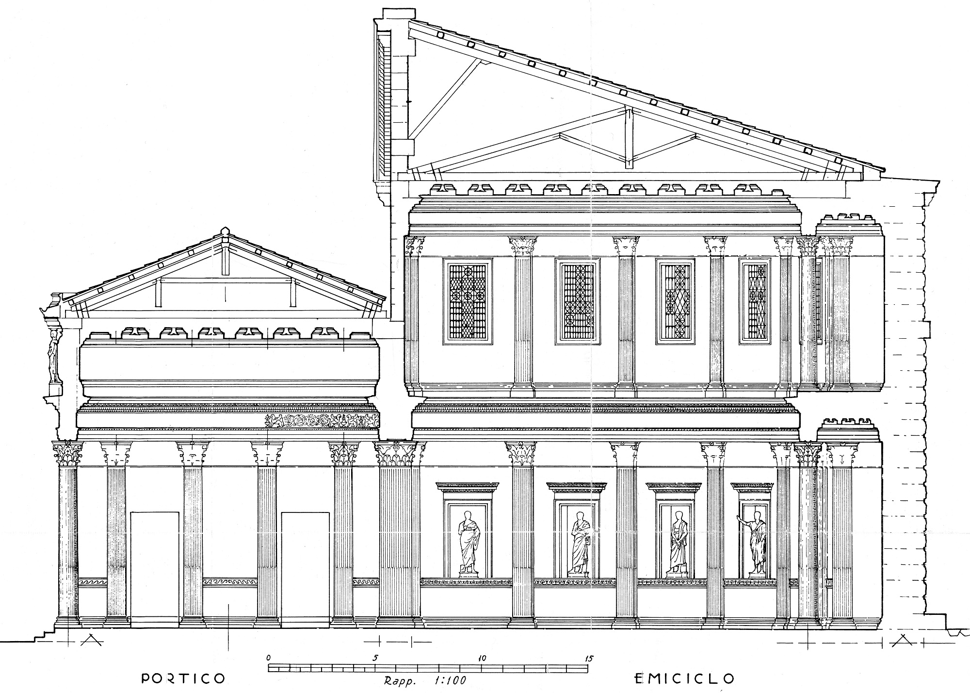 La piazza del Foro di Traiano era fiancheggiata sui lati lunghi da due portici profondi circa 15 metri, aperti ognuno su grandi emicicli di 40 metri di diametro. Le facciate dei portici erano sorrette da colonne scanalate di marmo pavonazzetto (proveniente dall’area dell’attuale Turchia, di colore bianco con venature violacee). L’attico era decorato da grandi scudi marmorei (clipei) con busti-ritratto al centro, alternati a statue di prigionieri Daci.
