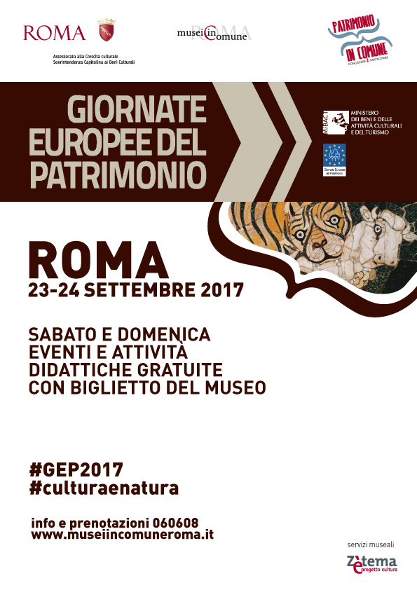 Sabato 23 e domenica 24 settembre l’Assessorato alla Crescita Culturale - Sovrintendenza Capitolina ai Beni Culturali aderisce alle Giornate Europee del Patrimonio#GEP2017, ideate dal Consiglio d’Europa e organizzate dal Ministero dei Beni e delle Attività Culturali e del Turismo.