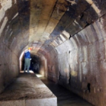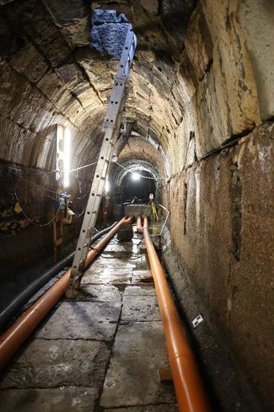 A partire dal 2009, la collaborazione tra la Sovrintendenza Capitolina e la Società Roma Metropolitane ha permesso di ottenere importanti risultati, scaturiti dalle complesse indagini conoscitive svolte nell’ambito del progetto Metro C (per la realizzazione della nuova tratta T3), che hanno interessato il segmento più a monte della Cloaca Massima, da Via Cavour ai Fori Imperiali (fig.10). In tale occasione è stato possibile avvalersi dell’utilizzo delle più moderne tecnologie di prospezione geognostica e di rilievo mediante utilizzo di strumentazione Laser-Scan all’interno dei condotti idraulici (fig.11), per indagare nel dettaglio le tecniche costruttive e valutare le reali condizioni del manufatto, che è apparso di livello straordinario. La deviazione delle acque reflue e la rimozione dei sedimenti, con l’illuminazione artificiale, per la prima volta hanno consentito di esaminare integralmente il condotto fognario e di rilevare la regolarità del fondo, formato da enormi blocchi di travertino con grappe metalliche ancora in posto, nonché il suo eccezionale stato di conservazione (fig.12).