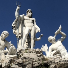 La fontana del Nettuno, collocata esattamente di fronte a quella della Dea Roma nell’emiciclo opposto, si compone di un’ampia vasca di travertino di forma semicircolare sopra la quale una grande valva di conchiglia, anch’essa di travertino, raccoglie l’acqua riversata da una piccola tazza posta poco più in alto.