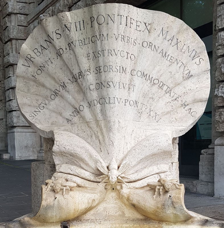 La fantasia dell’artista, tuttavia, diede ad una struttura di servizio, l’insolita forma di una conchiglia bivalve aperta. La valva più in basso fungeva da catino, mentre l’altra valva, modellata per aderire all’angolo dell’edificio retrostante, era decorata alla base da tre api (simbolo araldico della casata del Pontefice). Un’iscrizione ricordava l’intervento del papa per la costruzione della fontana e del fontanile come “pubblico ornamento della città”.