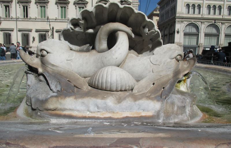 In un primo momento Giacomo Della Porta pensò di utilizzare una famosa statua di divinità fluviale del I sec. d.C., nota come statua di Marforio. Il progetto prevedeva di inserire la statua su un fondale a scogliera, accanto al basamento della colonna di Marco Aurelio. Nel progetto definitivo, tuttavia, eliminata l’idea di riutilizzo della statua, la fontana fu allontanata dalla colonna e posizionata parallelamente alla via del Corso, realizzando un’elegante vasca di forma ovale in marmo portasanta, arricchita sull’esterno da lesene con teste leonine in marmo bianco.